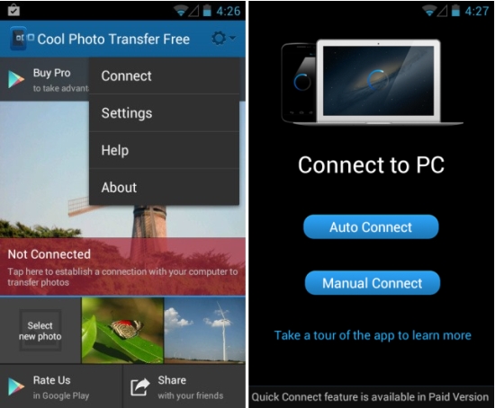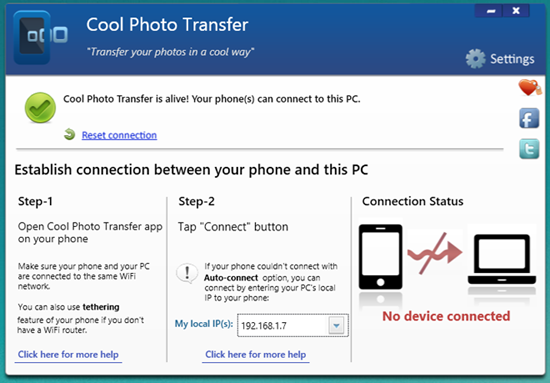 Прежде чем начать пользоваться приложением, его нужно настроить и установить соединение с ПК. Для этого на компьютер нужно установить клиент Cool Photo Transfer для Windows, а на Android – соответствующее мобильное приложение из Google Play. После этого следует убедиться, что оба гаджета находятся в одной сети Wi-Fi, и нажать на экране мобильного устройства кнопку Connect.