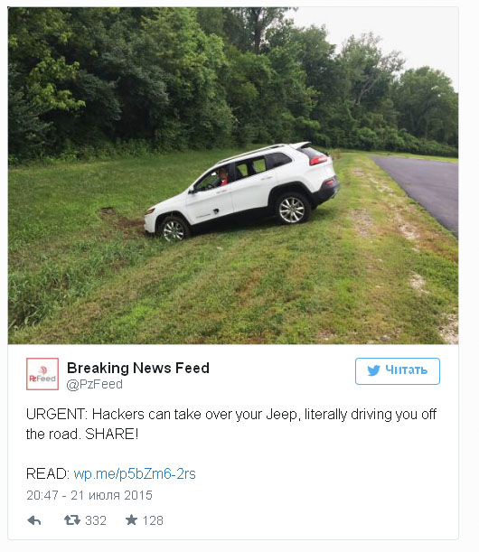 Пример подобной атаки наглядно продемонстрировал журнал Wired. Эксперты по безопасности смогли подключиться к движущемуся по шоссе Jeep Cherokee и перехватить управление. В середине июля автопроизводитель уже выпустил новую версию ПО, к которой хакерам подключиться уже нельзя.