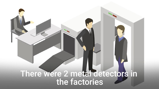 В раздевалке сотрудники хранят все свои вещи, включая всевозможные металлические предметы и телефоны. Для авторизации на заводе требуется ключ-карта и прохождение сканера распознавания лица. Потом все проходят через общую очередь через металлоискатель.