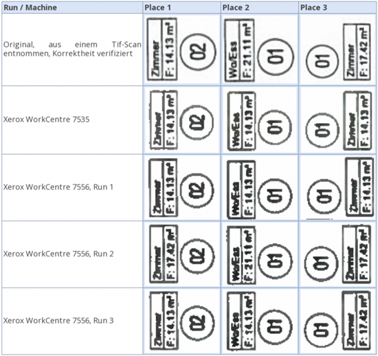 А началось всё 24 июля, когда Крисель — никому не известный докторант, увлечённый самоорганизующимися компьютерными системами, а на жизнь зарабатывающий в американском консалтинговом и проектном гиганте WorleyParsons, — столкнулся со странным поведением многофункциональных устройств Xerox. Изучая копию квартирного плана, сделанную на МФУ серии WorkCentre, Дэвид (или кто-то из его коллег) обнаружил, что жилая площадь указана неверно. Поскольку на оригинале стояла правильная цифра, было очевидно, что ошибка закралась в документ во время копирования. Чтобы убедиться, что им не померещилось, они изучили другие ранее откопированные документы, а также провели опыты на нескольких ксероксовских МФУ различных модификаций — с тем же результатом: цифры как будто кто-то подменял. Вот для примера отрывок из произвольной бухгалтерской ведомости, где хорошо заметно, как это происходило.