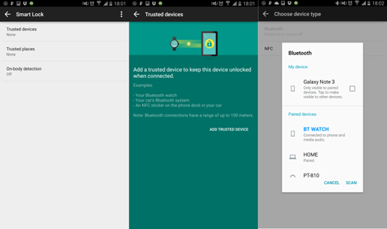 Первый способ позволяет указать доверенные устройства, например, смарт-часы или фитнес-браслет. Когда они будут находиться рядом с вами, экран вашего смартфона или планшета не будет блокироваться. Как только связь между гаджетами пропадет (например, вы отключите Bluetooth), вход в систему будет вновь защищен. Для снятия защиты также можно использовать NFC-метку или брелок.