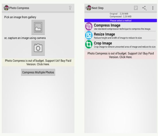 В главном окне приложения располагается меню, позволяющее выбрать изображение из Галереи устройства (Pick an image from gallery), ввести его непосредственно с камеры девайса (or, capture an image using camera) или изменить объем, занимаемый сразу несколькими изображениями (Compress Multiple Photos).