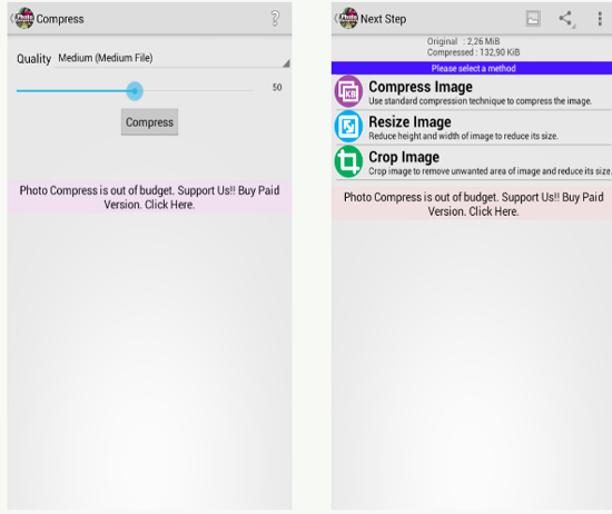 При касании «Compress Image» осуществляется переход в окно, позволяющее установить качество изображения (в процентах). Чем ниже качество картинки, тем меньше будет ее объем. После установки качества изображения (например, 50%), необходимо коснуться кнопки «Compress». После того как сжатие картинки будет произведено, можно увидеть, что объем исходного файла был уменьшен с 2,26 MiB (мегабайт) до 132,90 KiB (килобайт).