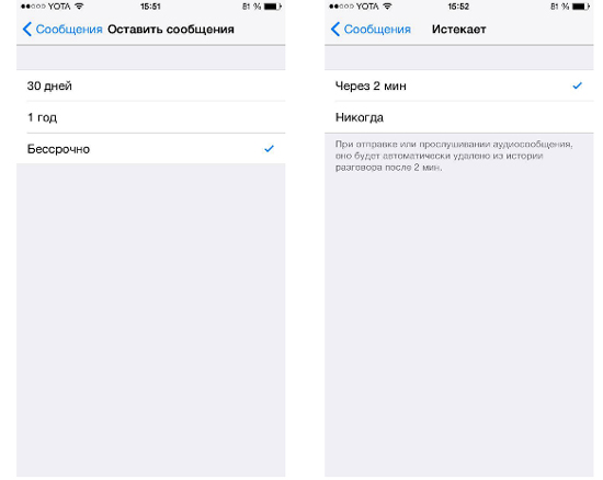 После этого пролистываем экран «Сообщений» до раздела «История сообщений». Здесь можно задать период автоматического удаления — 30 дней, 1 год или бессрочно (если вы не хотите очищать историю сообщений). Аналогичные действия можно провернуть и с аудиосообщениями.