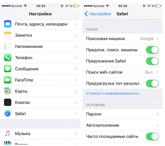 Необходимо перейти в настройки, где найти раздел с параметрами браузера Safari. Оттуда необходимо перейти к списку Основные