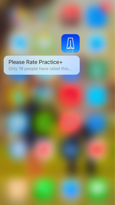 Видимо, отчаявшись найти применение для 3D Touch в своем продукте, разработчики приложения Practice+ решили вынести в контекстное меню, вызываемое усиленным нажатием на экран, одну весьма полезную для них самих функцию. Сильно нажимая на иконку приложения, пользователь получает возможность в одно касание оценить программу в App Store и оставить отзыв.