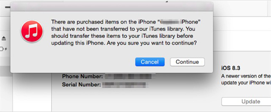 3. На всплывающее сообщение о том, что покупки не перенесены в библиотеку iTunes отвечаем «Продолжить».