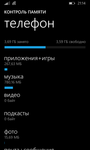 Прежде всего необходимо узнать, сколько же памяти уже задействовано и чем она заполнена. Для этого в Windows Phone 8.1 существует специальное приложение, которое называется «Контроль памяти». Запустить его можно либо из основного списка программ, либо из настроек смартфона.