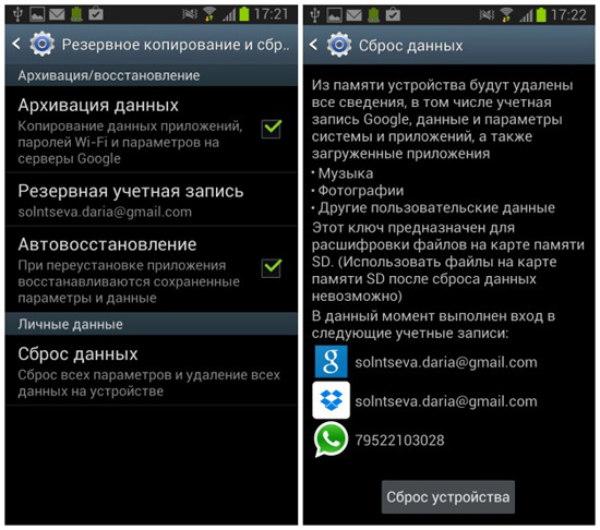 Ну и наконец самое главное. После того, как все наши данные были сохранены на внешних носителях или в облачных хранилищах, а карта была извлечена или отформатирована, можно сделать сброс данных и привести смартфон в чистое и непорочное состояние, в каком он попал в руки первого своего обладателя. Делается это из Настроек –> Личного –> Резервного Копирования и Сброса Настроек.