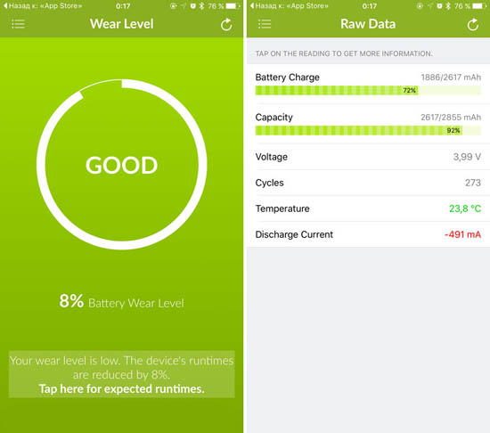Если ваш iPhone и iPad приобретен на вторичном рынке, то оценить состояние аккумулятора довольно проблематично. Для таких случаев пригодится стороннее приложение. Полезная программа называется Battery Life. На главном экране она показывает степень износа аккумулятора и дает оценку: Perfect (отлично), Good (хорошо), Bad (плохо) и Very Bad (очень плохо). Если в основном разделе перейти в меню Raw Data, то в строчке Cycles можно увидеть количество циклов зарядки аккумулятора.