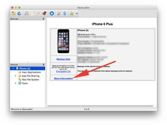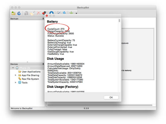 Узнать степень износа батареи iPhone и iPad можно также при помощи десктопного приложения iBackupbot. Запустив программу, нужно подключить iOS-устройство к компьютеру и в разделе Devices нужно выбрать гаджет. В правой части окна появится техническая информация. Здесь нужно нажать кнопку «More Information», где будет показано количество циклов заряда аккумулятора – CycleCount.