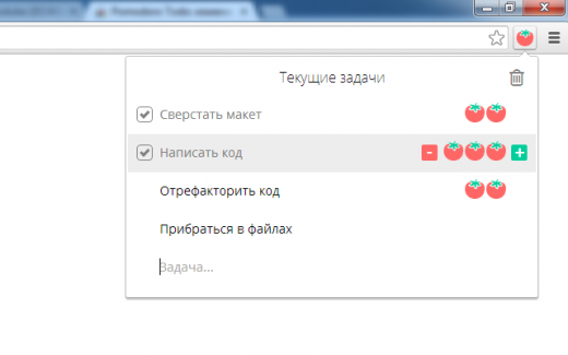 Это расширение не имеет таймера или счетчика, отсчитывающего рабочее и свободное время, зато имеет встроенный менеджер задач и инструмент для подсчета потраченных на их выполнение помидорок. Таким образом, Pomodoro Todo лучше всего использовать с каким-либо таймером времени, например с предыдущим расширением.