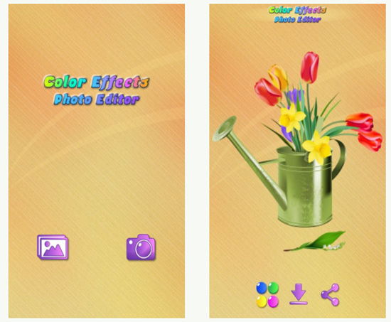Выбранное изображение будет загружено в окно приложения Color Effects Photo Editor. В нижней части экрана располагаются три кнопки. Первая, содержащая виртуальные цветные шарики, дает возможность перейти к выбору цветов. Нажатием на вторую (со стрелкой вниз) пользователь осуществляет сохранение измененного изображения. Третья кнопка дает возможность поделиться отредактированным изображением.