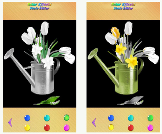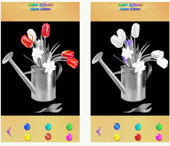 Панель, которая открывается после касания кнопки выбора цветов содержит шесть цветных шариков — синий, светло-синий, зеленый, желтый, красный и фиолетовый. Какого цвета шарика пользователь коснется, такой цвет и останется на изображении. Все остальное изображение станет монохромным («черно-белым»).
