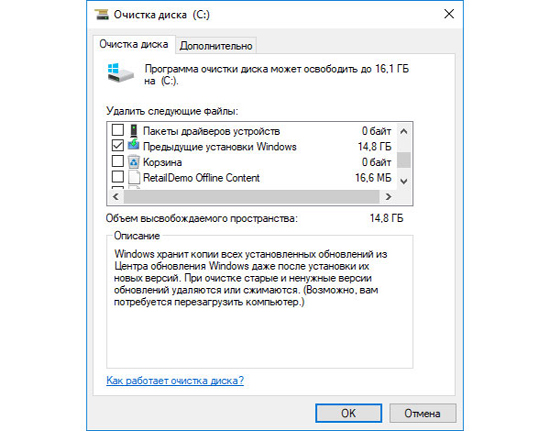 Все пользователи, обновившиеся на Creators Update с предыдущей версии системы, могут освободить до 20 ГБ на диске. Windows 10 сохраняет данные предыдущих версий ОС, чтобы при необходимости можно было сделать откат. Если такая функция вам не нужна, вы можете освободить пространство.
