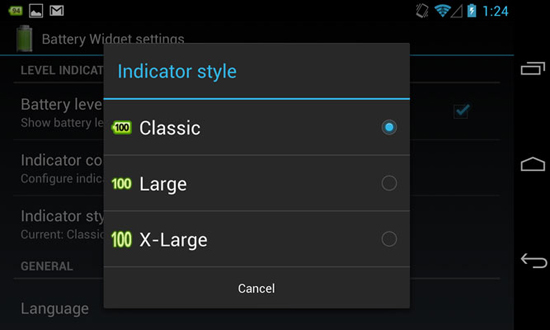 4. В разделе «Стиль индикатора» можно задать его вид и размер иконки. Если выбрать сверхбольшой, тогда пиктограмма батареи исчезнет и останутся одни цифры: