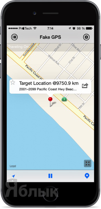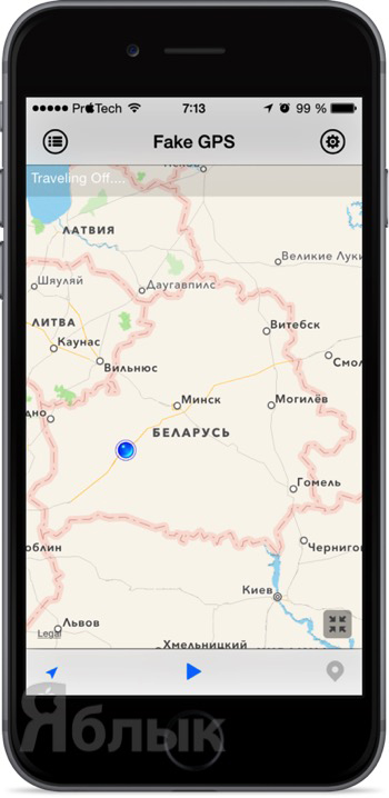 3. Нажмите кнопку «Play», после чего в левом верхнем углу появится надпись «Travelling On…», свидетельствующая о том, что ваш iPhone находится в другом месте.