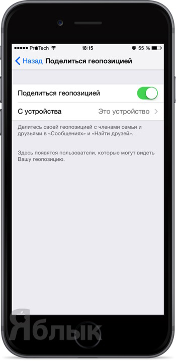 Откройте Настройки → Конфиденциальность → Службы геолокации и перейдите в меню «Поделиться геопозицией». Активируйте тумблер «Поделиться геопозицией» и перейдите в меню «С устройства».