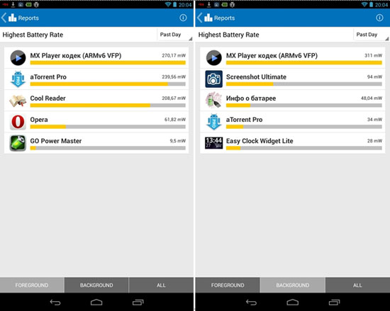 Уровень потребления энергии установленными мобильными программами в активном и фоновом режимах