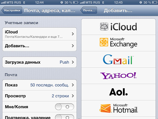 • При миграции на другой телефон первым делом стоит позаботиться о переносе самой важной информации — контактов. Если на Android вы пользуетесь сервером синхронизации (а в большинстве случае это так), откройте на "айфоне" настройки → "Почта, адреса, календари" → нажмите "Добавить..." → выберите нужный сервис (например, Microsoft Exchange или Google), а затем введите адрес и пароль.
