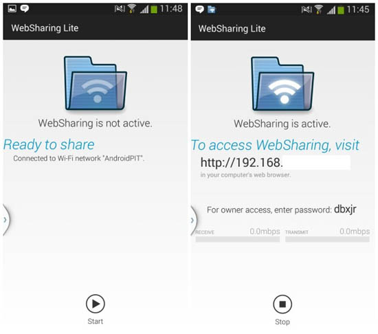 Данный способ поистине легкий и быстрый. Он не требует никаких кабелей, проводов и прочей атрибутики – только стабильное Wi-Fi соединение. В основе лежит приложение Web Sharing Lite, не требующее клиента на компьютере. Скачиваем программу и открываем ее. Если сигнал Wi-Fi удовлетворителен, на экране высветится сообщение «Ready to Share» в синем цвете. Далее нужно нажать на Start.