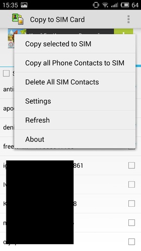 4.Из выпадающего меню по кнопке с тремя выберите пункт Copy selected to SIM и дождитесь окончания операции.