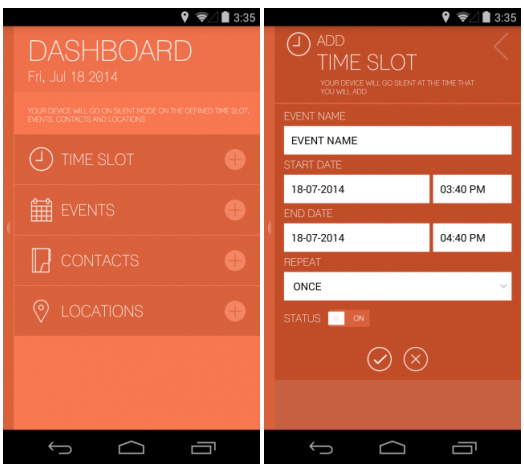 Знакомство с программой начинается со стартового экрана, на котором вы можете выбрать один из доступных триггеров. Вы можете настроить включение тихого режима или вибрации в определённое время, при наступлении события из вашего календаря, для отдельного контакта или при нахождении вас в конкретной локации. При этом данные о мероприятиях подтягиваются из вашего календаря, что позволяет автоматически включать беззвучный режим на совещаниях, свиданиях и при других событиях, не терпящих телефонной суеты.