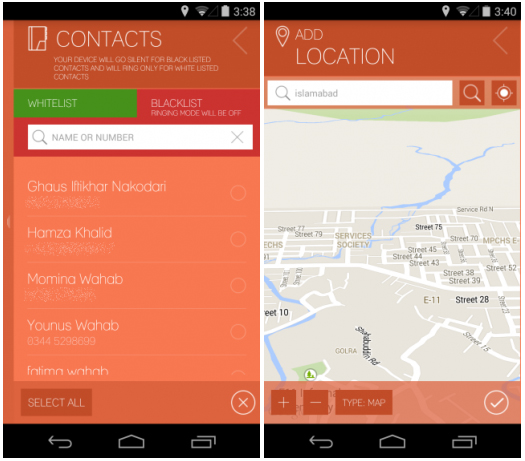 При выборе контактов из адресной книги вы можете занести их в белый или чёрный список, при этом звонки из последнего будут игнорироваться и не смогут вас потревожить. А при задании местоположения на карте есть возможность задать радиус области, в которой телефон будет автоматически включать беззвучный режим.