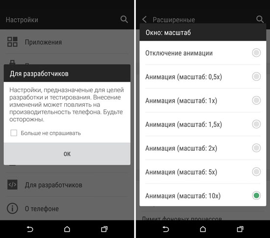 Вернитесь в основной раздел настроек и найдите пункт «Для разработчиков». Здесь в разделе «Расширенные» нужно найти «Анимация окон», «Анимация перехода», «Длительность анимации» и установить значения 10х (по умолчанию 1х).
