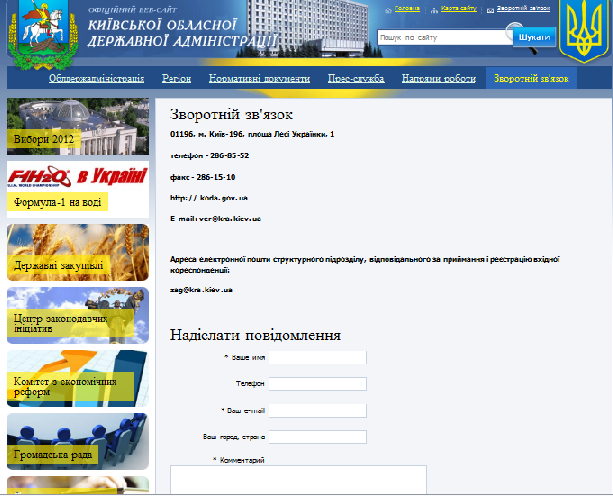 К сожалению, лишь немногие веб-сайты городских советов и областных администраций предлагают пользователям электронные приемные для оформления обращений граждан. Жители Киева могут оформить не официальную жалобу на сайте КГГА. К сожалению, предложенная на сайте КГГА электронная форма обращения дает возможность городским чиновником идентифицировать жалобу как анонимную и не отвечать на нее.