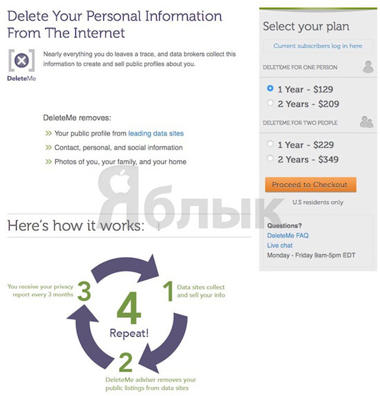 Здесь на помощь может прийти сервис DeleteMe на сайте Abine.com. Заплатив $130 или оформив годовую подписку, вы избавитесь от неприятной рутины, доверив всю работу сервису. На данный момент данная процедура работает только для резидентов США.