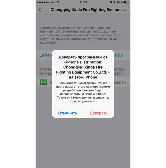 Шаг 6: iOS откроет диалоговое окно, которое предложит поставить на устройство сертификат разработчика. Подтвердите установку, нажав кнопку «Установить».