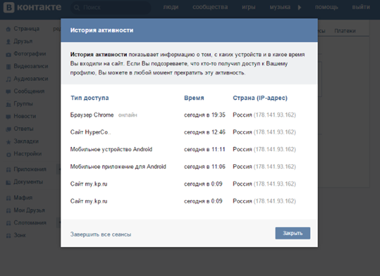 Пароли от аккаунтов в соцсетях подбирают и воруют все кому не лень. «ВКонтакте» можно посмотреть последние действия с аккаунтом: с какого IP-адреса, компьютера или приложения заходили. Если вы обнаружили подозрительную активность, просто завершить все сеансы недостаточно, нужно поменять пароль, а можно еще и настроить двухфакторную аутентификацию.