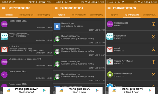 Доступ к истории уведомлений можно получить с помощью Past Notifications — это приложение хранит до двух тысяч записей со всеми подробностями и возможностью фильтрации нужного контента.