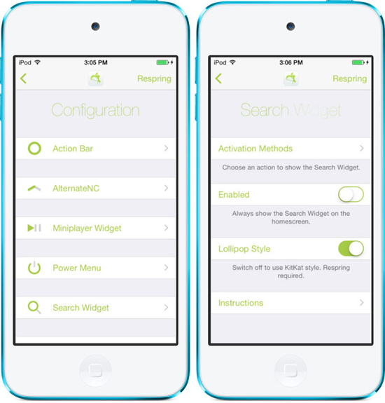 Разумеется, речь не идет о полноценном опыте использования платформы Android с помощью Andrios. Утилита лишь переделает внешний вид основных элементов интерфейса iOS и добавит некоторые новые. Программное дополнение переносит на iPhone семь компонентов: Action Bar, AlternateNC, Miniplayer Widgets, Power Menu, Search Widget, Switches Widget и Volume Slider.