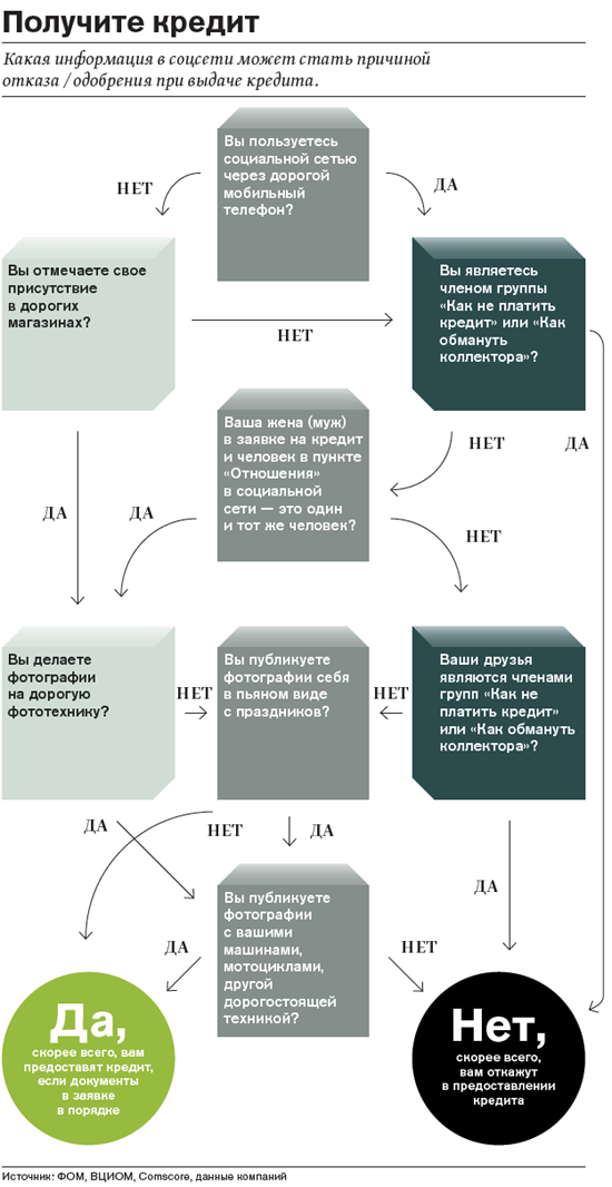 Социальные сети являются поставщиками информации и для кредитных бюро в США. Их сотрудники изучают фотографии потенциального заемщика, например, как часто человек фотографируется в пьяном виде. Шансы нетрезвых весельчаков на получение кредита уменьшаются. Кроме того, аналитики обращают внимание на то, в какие магазины и как часто ходит человек, какие СМИ читает, каков социальный статус его друзей, в каком учебном заведении он учился и кто его однокурсники и одноклассники, на какую информацию ставит like. Эти данные позволяют составить психологический портрет заемщика и важны не менее, чем финансовая информация о размере зарплаты и количестве долгов.