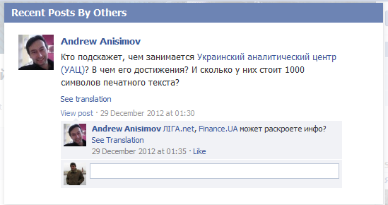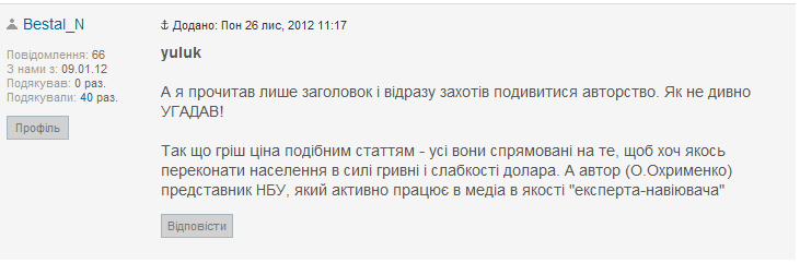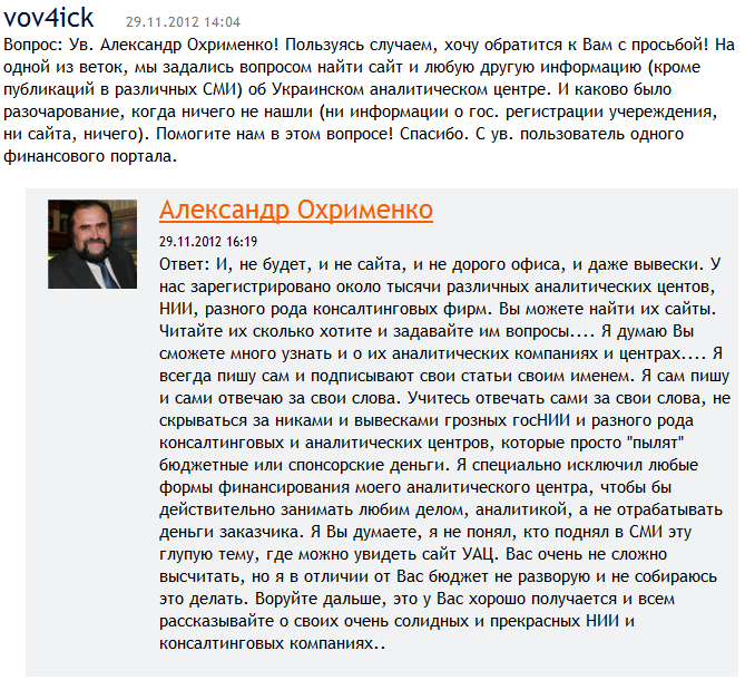 Пользователи популярного финансового портала finance.ua уже долгое время пытаются выяснить, что же за организация «Украинский аналитический центр», экспертом которой является Охрименко. Никакой официальной информации по этому поводу нет. Сам же Охрименко на подобные вопросы либо отмалчивается, либо отвечает следующим образом: