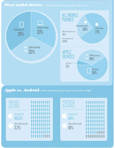 Сегодня при посадке на борт воздушного судна официально запрещено пользоваться мобильниками, и пассажиры обязаны их выключать, даже несмотря на наличие режима «В самолете». Но некоторые авиакомпании самостоятельно устанавливают требуемое оборудование в свои самолеты и предоставляют пользователям доступ в интернет на высоте несколько десятков километров. Услуга уже стала сравнительно популярной: отчет американского Wi-Fi-провайдера Gogo, предоставляющего выход в Сеть на воздушных судах, показывает растущую активность владельцев Android-гаджетов.
