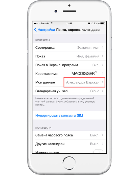 Чтобы персональный ассистент Apple знал, кто является владельцем мобильного устройства, предварительно нужно зайти в настройки iOS и указать контакт. Делается это в разделе Настройки –> Почта, адреса, календари –> «Мои данные». Создать отдельный контакт для связи можно в Адресной книги.