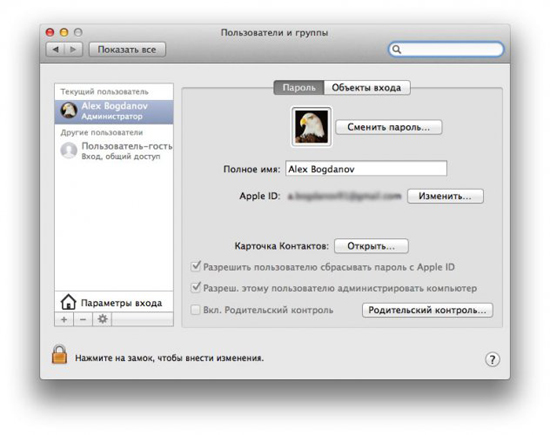Вся процедура займет у вас не больше минуты, однако польза от нее будет в разы больше. Открываем системные настройки, далее меню «Пользователи и группы», где выбираем профиль администратора. Под разделом «Полное имя» есть кнопка для ввода логина и пароля вашего Apple ID. Чтобы все получилось, обязательно ставим галочку около пункта «Разрешить пользователю сбрасывать пароль с Apple ID».