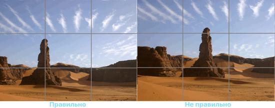 Перед тем, как сделать снимок, мысленно разделите его на трети параллельными линиями, как вертикально, так и горизонтально. Получится решетка из девяти одинаковых квадратов.