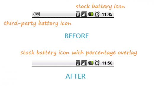 Есть много различных утилит для отображения точного заряда батареи. Но обычно они делают это либо с помощью виджета на рабочем столе, что не всегда удобно, либо с помощью собственного значка на панели уведомлений, что приводит к существованию сразу двух индикаторов — системного и другого. Battery Overlay Percent лишен этих недостатков и умеет демонстрировать уровень состояния батареи в процентах прямо поверх стандартного значка.
