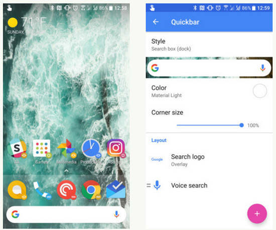 Для активации обновленного окна поиска в настройках Action Launcher нужно перейти в раздел Quickbar, нажать на Style и выбрать Search box (dock). Здесь же можно выбрать цвет строки поиска, а также вид его элементов. Можно даже изменить радиус закругления углов виджета.