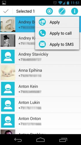 Созданный сигнал можно сохранить в приложении, после чего начинается процесс присваивания его к определённому действия и контакту. Нажимаем кнопку в правом нижнем углу, после чего находим нужный контакт и выделяем его. С помощью кружка в верхней части экрана выбираем вид действия для контакта (звонок, SMS, либо то и другое). При желании можно прикрепить сигнал сразу к нескольким контактам.
