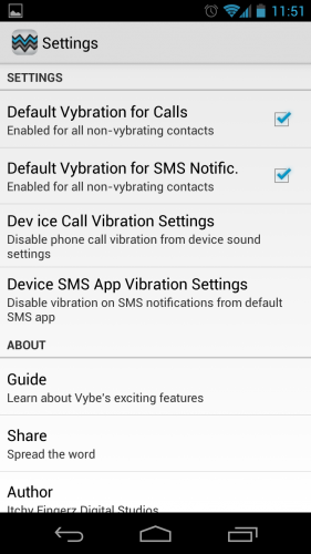 Для корректной работы приложения необходимо, чтобы стандартный вибросигнал в системе был отключен. Если искать нужное меню лень, то просто заходим в настройки Vybe — там есть ссылки к управлению сигналами звонка и SMS.