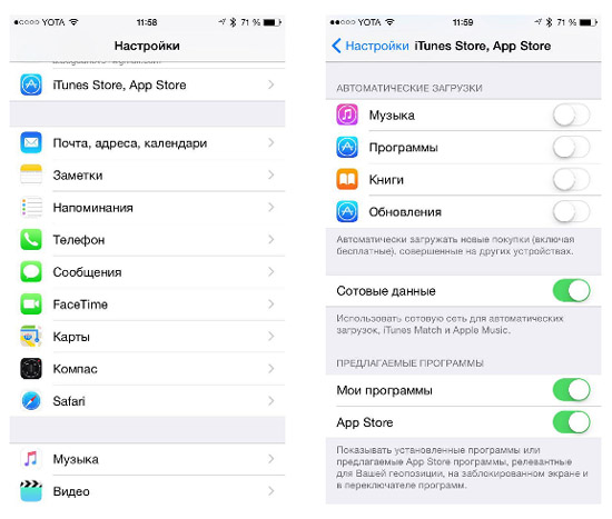 В случае, если вы вдруг покупали/загружали музыку на компьютере с помощью iTunes, ваш iPhone или iPad может начать скачивать ее с помощью мобильного интернета. Не хотите этого допустить? Тогда зайдите в настройки — вкладку iTunes и App Store, а затем отключите автоматические загрузки для музыки.