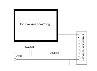 Электрод должен иметь максимальную прозрачность, достаточную прочность, равномерность и низкое сопротивление электропроводного покрытия, выдерживать высокое напряжение. Для таких целей в самодельных устройствах предлагают использовать электроды из двух стёкол, между которыми заливают солёную воду, или тонкое покрытие из оксидов индия и олова (ITO) (в качестве последнего отлично подходят резистивные сенсорные панели для мобильных телефонов).