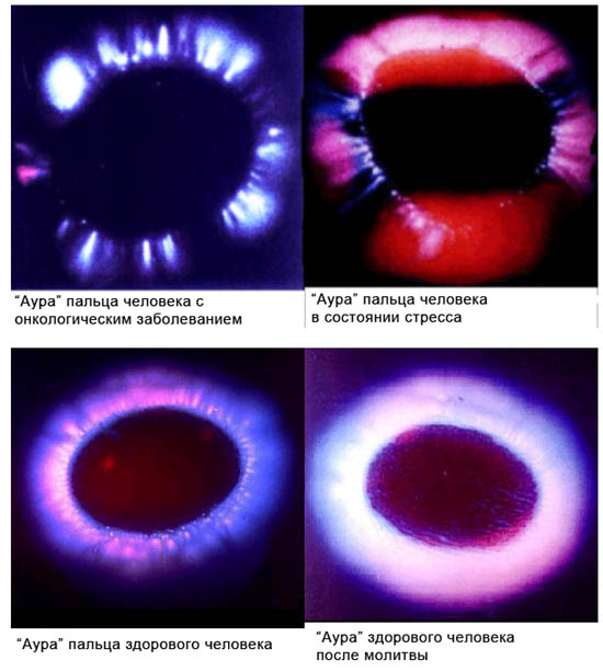 Обнаружилось, что у лиц, страдавших тем или иным заболеванием, наблюдалось строго определенное изменение структуры светящейся короны — менялось свечение у заболевшего вдруг человека: появлялись тёмные точки, пятна, сужалось и превращалось в рваные куски некогда ровное поле. Любопытно, что в некоторых случаях это изменение оказалось возможным зафиксировать еще до появления первых симптомов болезни...».
