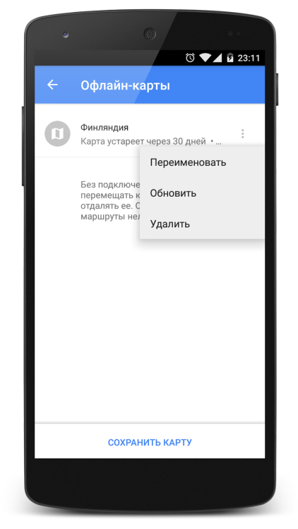 -Пролистать страницу до самого конца и тапнуть по вашей карте или открыть настройку офлайн-карт, откуда вы можете сохранить новую карту, переименовать, обновить или удалить старую.