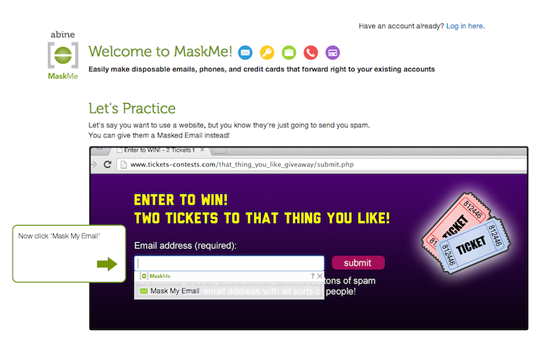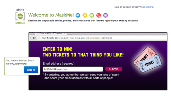 Сервис MaskMe ещё проще в использовании: это расширение для браузеров Chrome и Firefox создаёт всплывающее окно всякий раз, когда на каком-либо сайте появляется форма с запросом почтового адреса, и предлагает «замаскировать его» с помощью подложного адреса. Все сообщения, поступающие на такой адрес, будут переправляться на вашу реальную почту (для этого нужно зарегистрироваться), но для владельцев сайта она останется неизвестной. Платная версия ($5 в месяц) позволит аналогичным образом подменять телефонный номер и данные платёжной карты.